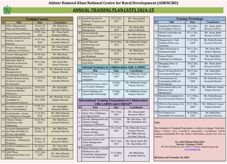 The Annual Training Calendar highlights the details of AHKNCRD training programmes. Computer Lab have also been established at AHKNCRD to conduct Computer trainings. No training fee is charged from participants for all of the courses. However, the departments/organizations of the nominees bear the cost of TA & DA etc. Hostel accommodation for participants on double occupancy basis is available at affordable rates. Besides accommodation mess facility is available on self-financing basis. AHKNCRD also extends logistical, secretarial and faculty support to national and international organizations for seminars, workshops and training courses.